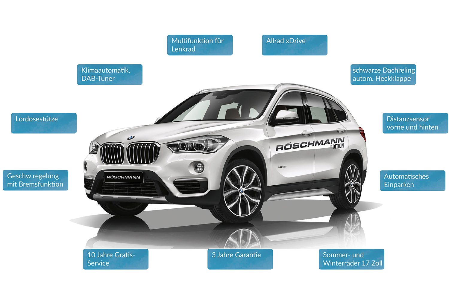 Wählen Sie Ihren BMW X1 aus unserem Lager aus und nehmen Sie ihn gleich mit. Oder stellen Sie Ihre eigene Röschmann Edition zusammen. Die Lieferzeit beträgt 3 bis 8 Wochen.
